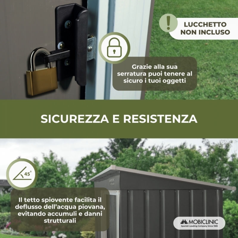 Il tetto spiovente facilita il deflusso dell'acqua piovana, evitando accumuli o perdite, contribuendo anche alla sua durevolezza. Inoltre, grazie alla porta scorrevole, l'accesso è molto comodo e consente di introdurre facilmente oggetti di grandi dimensioni. Non avendo pavimento, si adatta a qualsiasi terreno.