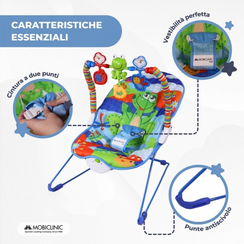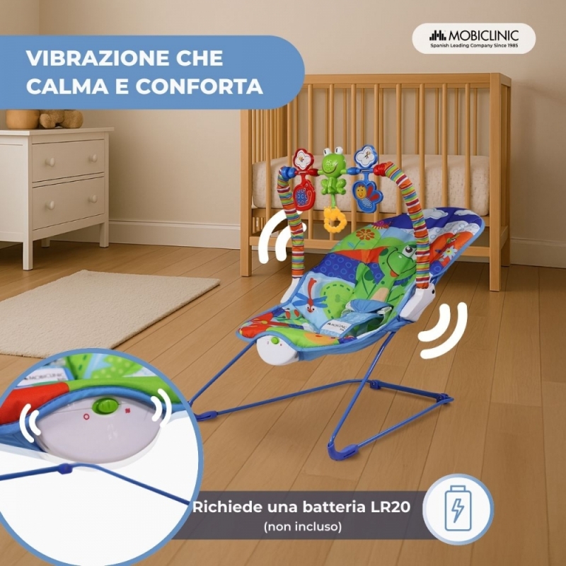 VIBRAZIONE RILASSANTE: la sdraietta Flash è dotata di un delicato sistema di vibrazione che si attiva sotto il poggiapiedi della seduta. La vibrazione aiuta a calmare e rilassare il bambino, favorendone il riposo e offrendogli maggiore comfort. Un tocco di benessere in più per il tuo piccolo!