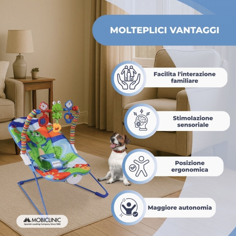 Per quanto riguarda il riposo, è dotato di un sistema di vibrazione rilassante che aiuta a calmare il bambino. Questa caratteristica è perfetta per creare un ambiente rilassante e confortevole. L'amaca include anche giocattoli interattivi che stimolano lo sviluppo sensoriale del bambino, fornendo stimoli visivi e sonori per attirare la sua attenzione.