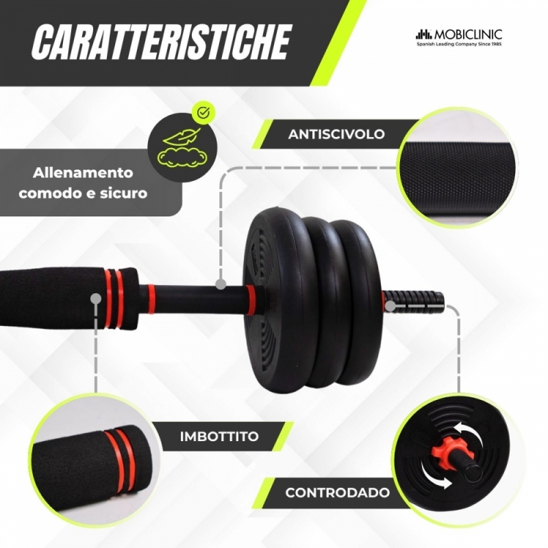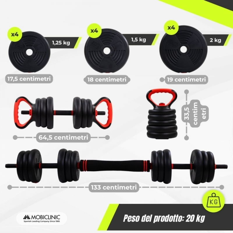 Questo set è stato progettato pensando a funzionalità, sicurezza e comfort. Il suo peso totale è di 20 kg (19 kg per i dischi + 1 kg per gli accessori), permettendoti di personalizzare il tuo allenamento aggiungendo o rimuovendo facilmente i dischi in base alle tue esigenze. Oltre alla sua funzionalità, questo set si distingue per il suo design compatto e facile da riporre, occupando pochissimo spazio, ideale per l'allenamento a casa o in viaggio.