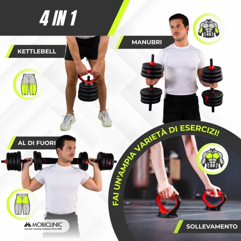 Il set di manubri Mobimax è perfetto per chi cerca un attrezzo per l'allenamento a casa che si adatti a una varietà di esercizi. Grazie al suo design 4 in 1, offre quattro diverse modalità: manubri tradizionali, kettlebell, barra per trazioni e supporto per flessioni.