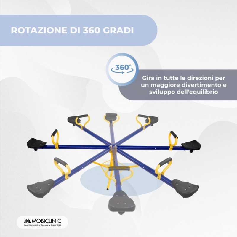 ROTAZIONE A 360°: L'altalena Mobifun è progettata per offrire un'esperienza di gioco perfetta grazie alla sua capacità di rotazione a 360°. Questo permette ai bambini di dondolarsi in qualsiasi direzione, promuovendo lo sviluppo dell'equilibrio e della coordinazione fin dalla tenera età.