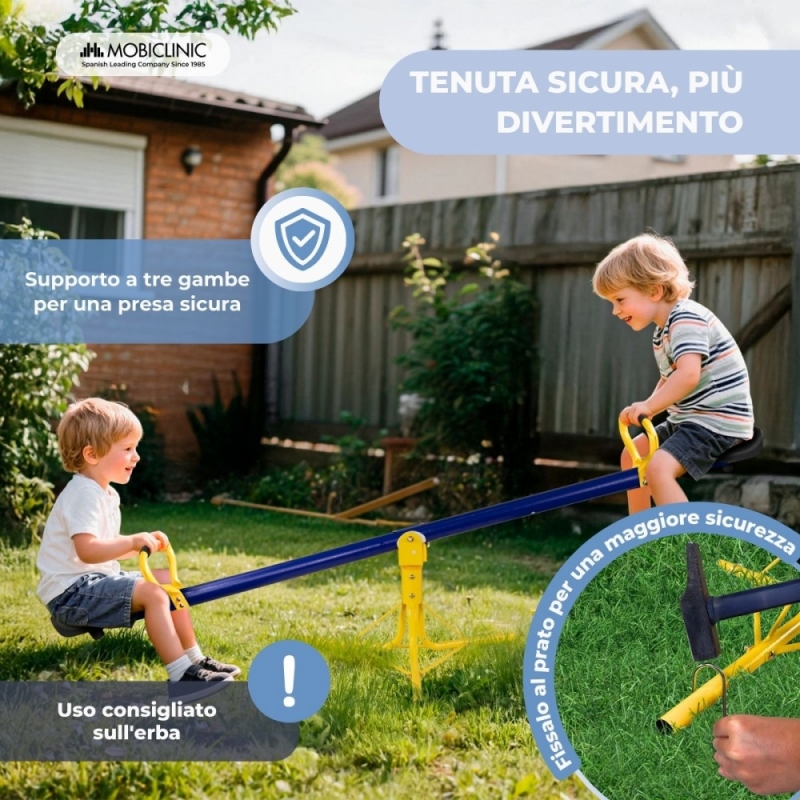 L'altalena Mobifun è progettata per far giocare due bambini contemporaneamente, incoraggiando l'interazione, la cooperazione e lo sviluppo delle abilità sociali fin dalla tenera età. Le sue sedute comode ed ergonomiche offrono una postura comoda durante il gioco.