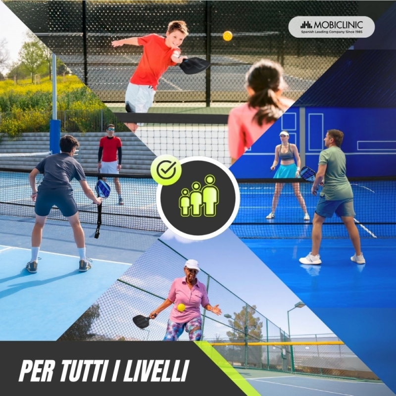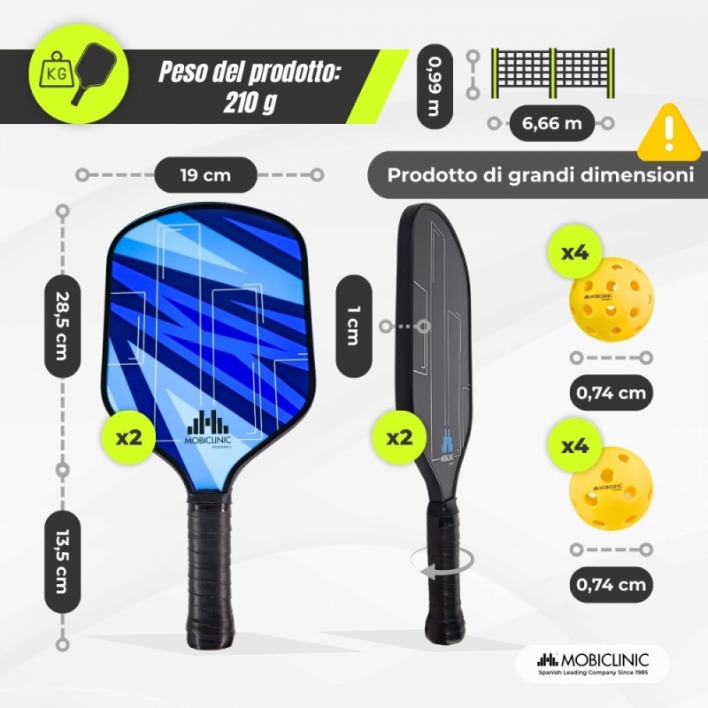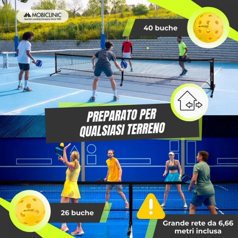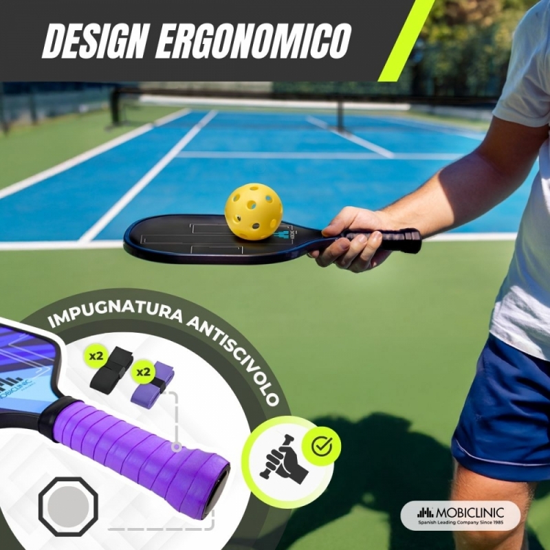 Il set da pickleball Mobiall è la scelta perfetta sia per i principianti che per i giocatori esperti in cerca di un'attività fisica divertente e completa. Include quattro racchette in fibra di vetro con anima in polimero a nido d'ape, un materiale che offre una combinazione di controllo e potenza durante il gioco. Le impugnature ergonomiche con impugnatura antiscivolo e assorbente garantiscono una presa confortevole.