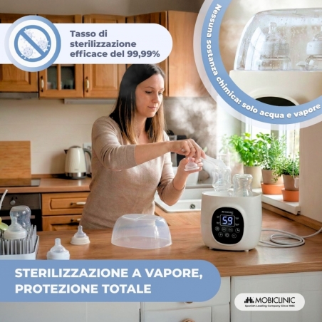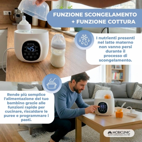 La funzione di scongelamento è stata testata per preservare i nutrienti essenziali del latte materno, mentre la funzione di sterilizzazione garantisce l'eliminazione del 99,99% di germi e batteri, assicurando un'igiene ottimale. Il dispositivo è inoltre in grado di mantenere la temperatura desiderata per 48 ore, consentendo di mantenere il latte o gli alimenti sempre caldi, ideale per lunghe notti o viaggi.