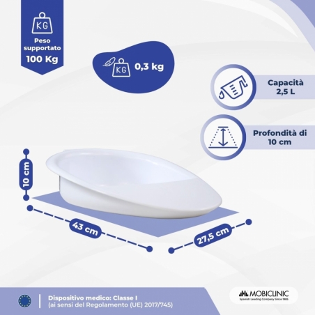 GRANDE CAPACITÀ: Questa padella ha una capacità di 2500 ml, impedendo il traboccamento e consentendo un uso prolungato senza dover essere svuotata immediatamente. Ciò offre un maggiore comfort sia al paziente che all'operatore sanitario.