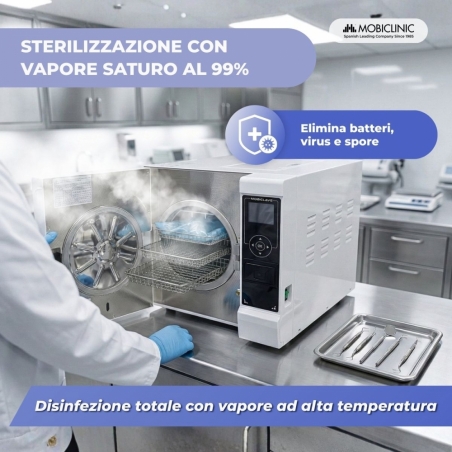 L' autoclave sterilizzante Mobiclinic da 8 litri è una soluzione professionale che offre una sterilizzazione completa, efficace e sicura , progettata per tutti i tipi di ambienti clinici. Utilizza vapore saturo al 99% per inattivare batteri, virus, funghi e spore , garantendo un processo di pulizia affidabile anche negli ambienti più esigenti.