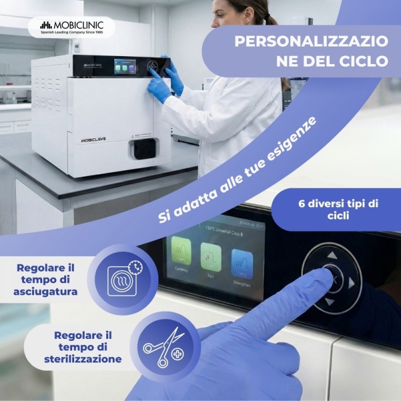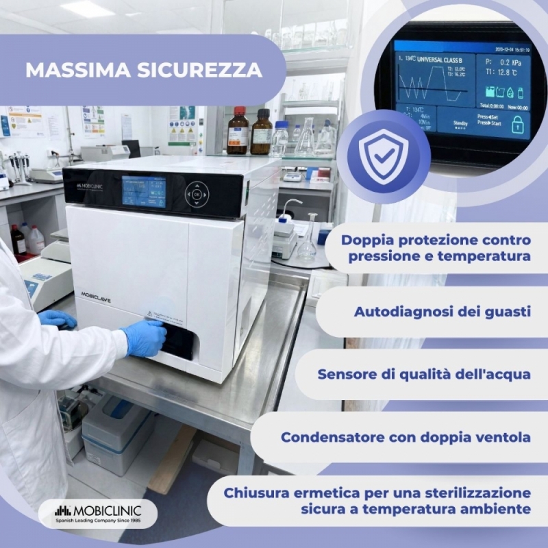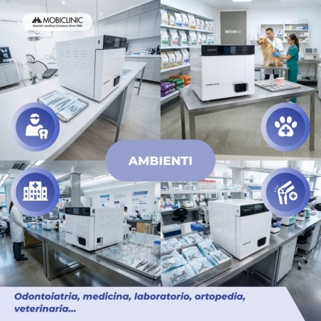 STERILIZZAZIONE PROFESSIONALE E COMPLETA: L'autoclave Mobiclinic da 17 litri disinfetta utilizzando vapore saturo al 99%, eliminando microrganismi, virus, funghi e spore. È ideale per ambienti professionali come studi dentistici e medici, laboratori, cliniche ortopediche e centri veterinari.