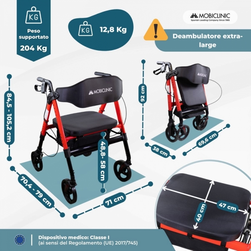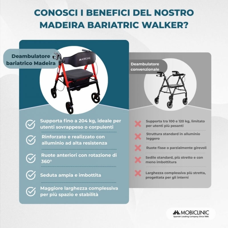 Il deambulatore bariatrico Madeira Mobiclinic è progettato per offrire la massima stabilità, resistenza e comfort . Con una capacità di carico fino a 204 kg , supera di gran lunga i modelli standard (100-120 kg), rendendolo ideale per utenti in sovrappeso o per chi cerca maggiore sicurezza negli spostamenti.