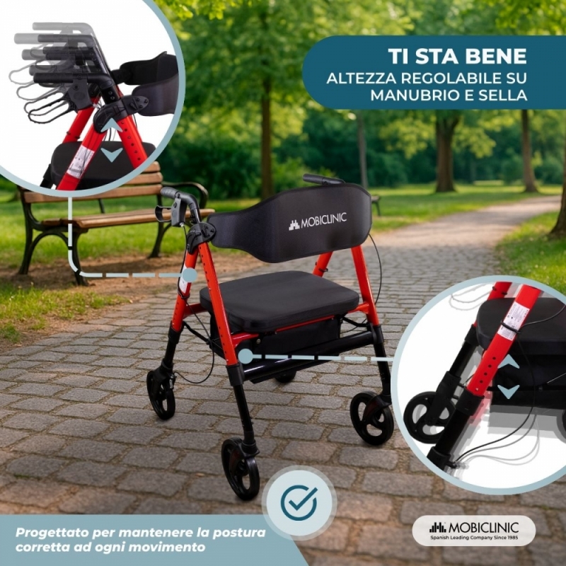 Il sistema di chiusura è semplice e veloce: basta azionare la barra sotto la seduta per compattare il deambulatore e trasportarlo o riporlo senza sforzo. Le ruote anteriori piroettanti da 8 pollici con rotazione a 360 gradi offrono un'ottima manovrabilità, mentre le ruote rimovibili consentono di risparmiare spazio.