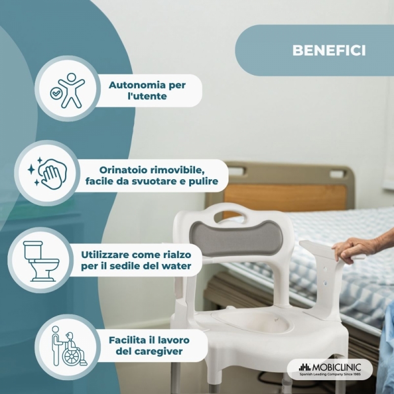 ORINATOIO INCLUSO: Questa sedia è dotata di un orinatoio rimovibile che supporta fino a 6 kg e ha una capacità fino a 3500 ml, offrendo grande autonomia all'utente. La rimozione dell'orinatoio è molto semplice, facilitando la pulizia e mantenendo la sedia sempre igienica per l'uso.