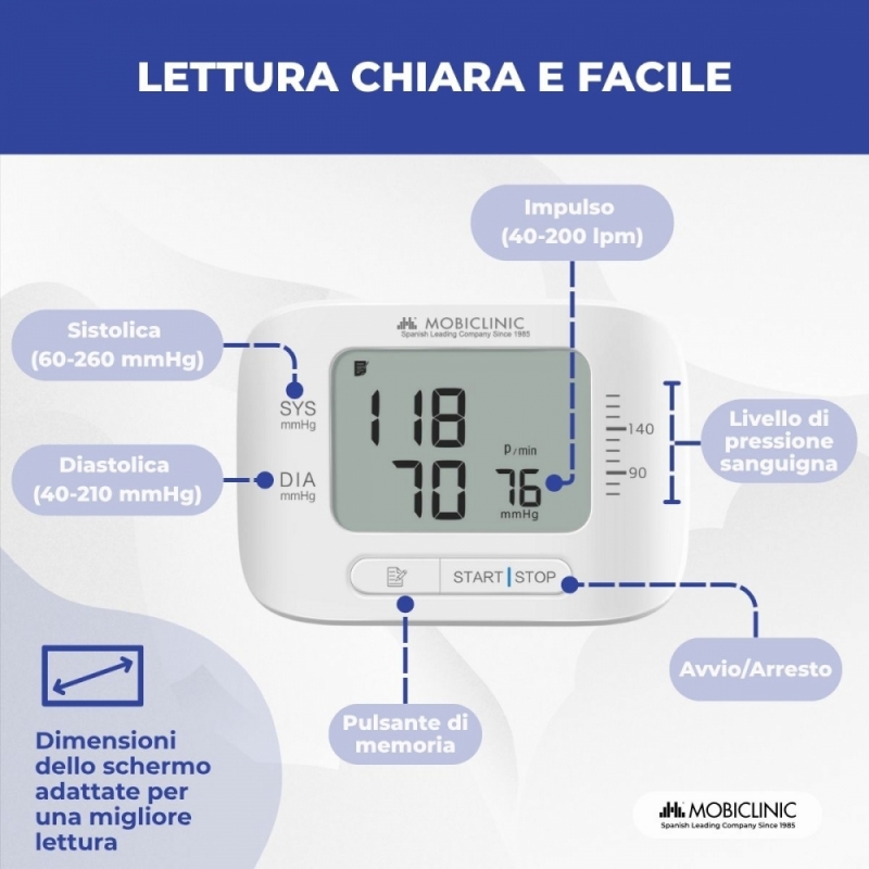 Misura con precisione in un intervallo da 0 a 300 mmHg (da 0 a 40,0 kPa), consentendo inoltre di misurare i risultati in due unità diverse: kPa o mmHg, a seconda delle preferenze.