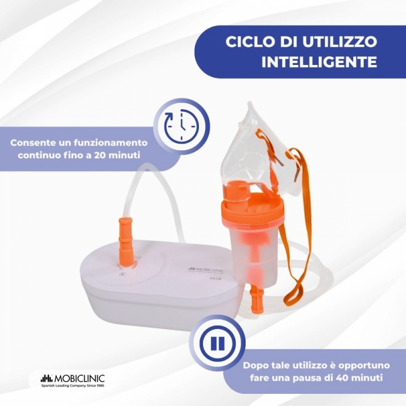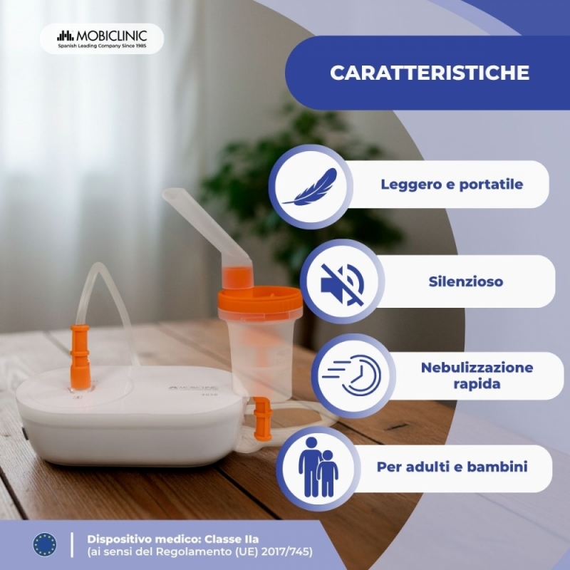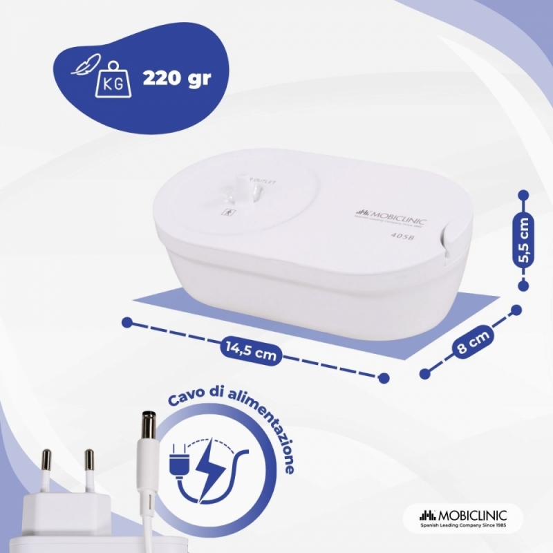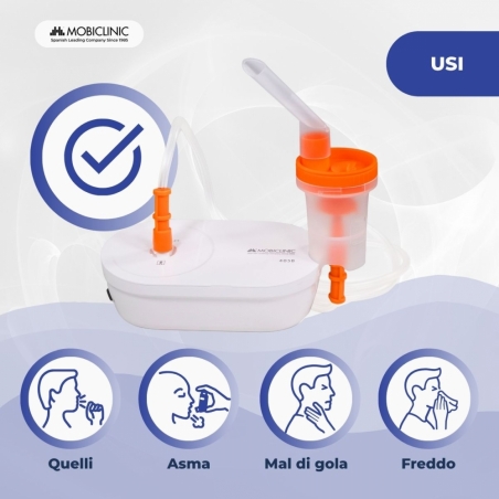 Il suo design compatto e leggero lo rende facile da riporre e trasportare. Funziona in modo semplice, collegandosi alla rete tramite USB. Per quanto riguarda l'igiene, i suoi componenti sono facili da smontare, facilitando la pulizia. Il misurino e il boccaglio si disinfettano tramite bollitura, mentre le maschere possono essere disinfettate con alcol. Il tubo dell'aria deve essere solo risciacquato e asciugato con un panno.