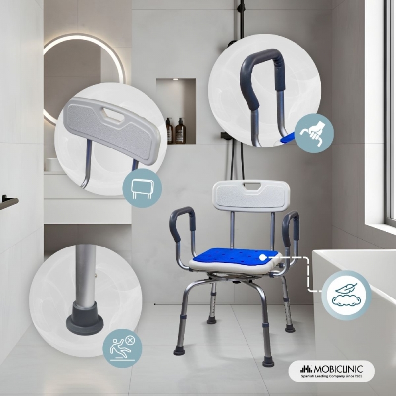 Lo sgabello da bagno girevole Akila offre comfort e sicurezza sotto la doccia e per l'igiene personale, ideale per anziani, persone in fase di riabilitazione o persone con mobilità ridotta. Grazie alla seduta girevole, è possibile effettuare movimenti fluidi e sicuri senza dover ruotare il corpo, riducendo il rischio di cadute o lesioni. Incorpora un sistema di bloccaggio di sicurezza che impedisce movimenti indesiderati e offre maggiore stabilità all'utente durante l'utilizzo.