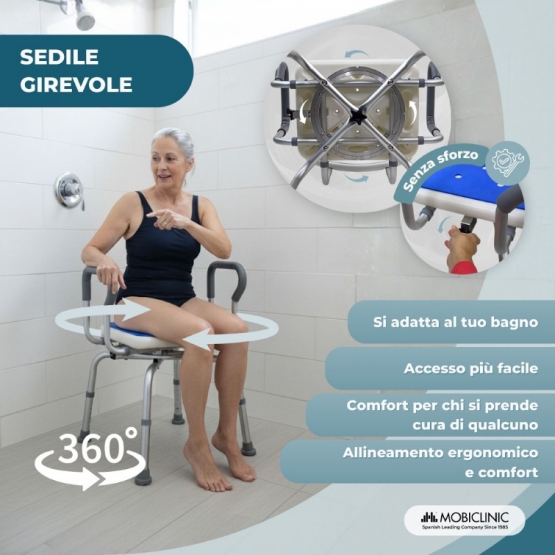 Sgabello girevole per bagno | Seduta a 360º | Altezza regolabile | Braccioli | Seduta con cuscinetto in EVA | Akila | Mobiclinic