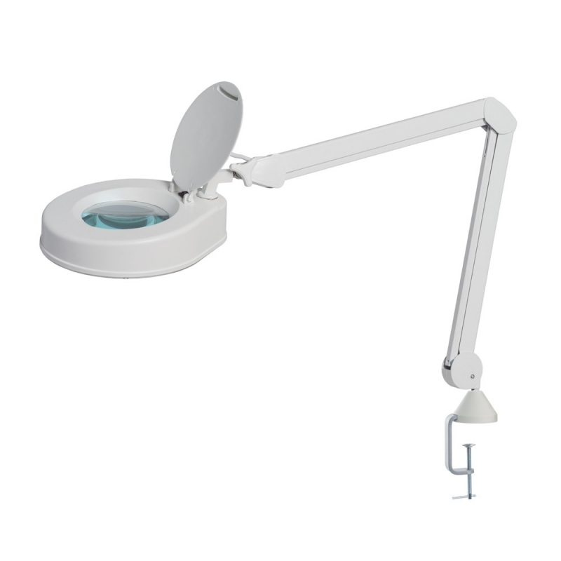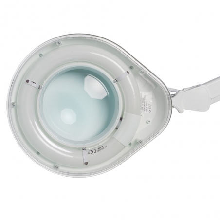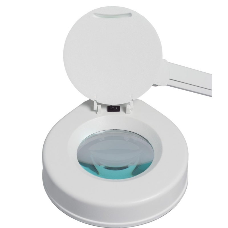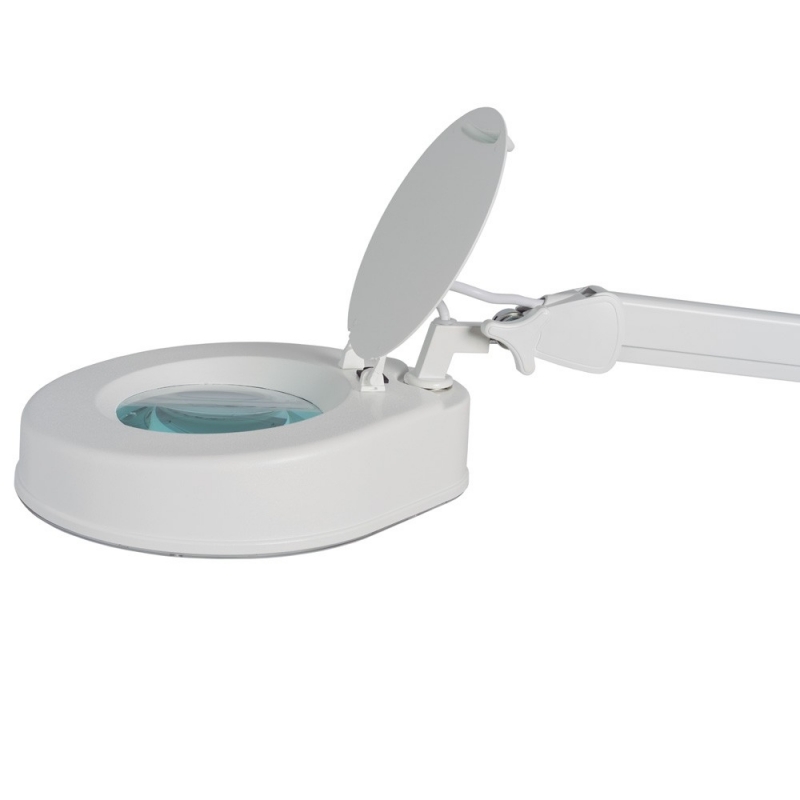 Incorpora una lupa fluorescente circular de 22W y 5 dioptrías. Produce una luz sin sombras y no calienta. Brazos compensados por muelles internos. Interruptor situado en el cabezal. Cabezal ajustable. Tapa de seguridad para evitar polvo, rozaduras u otros factores externos que puedan dañar la lente.