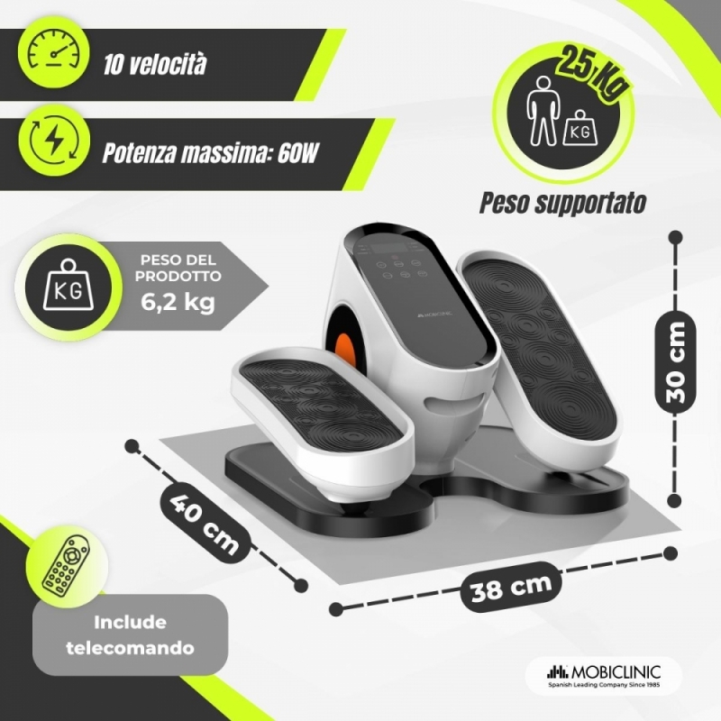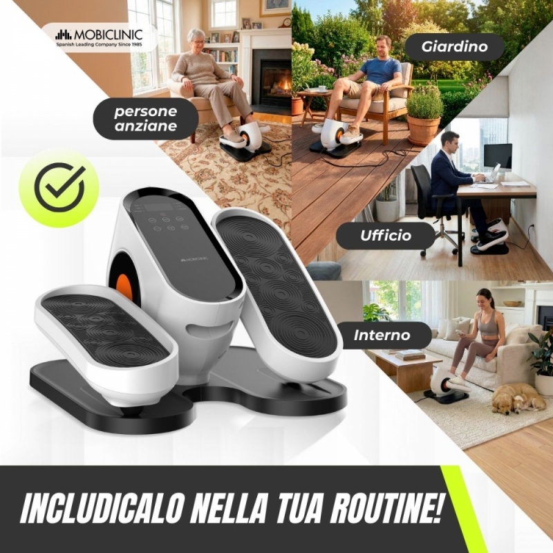 La mini ellittica Mobidal è progettata per offrire un allenamento comodo e accessibile a casa, in ufficio o in qualsiasi altro spazio. È la soluzione perfetta per mantenere l'attività fisica quotidiana, migliorare la mobilità e favorire la circolazione nelle articolazioni senza impatto.