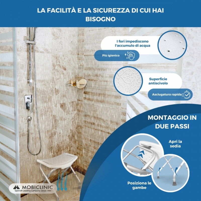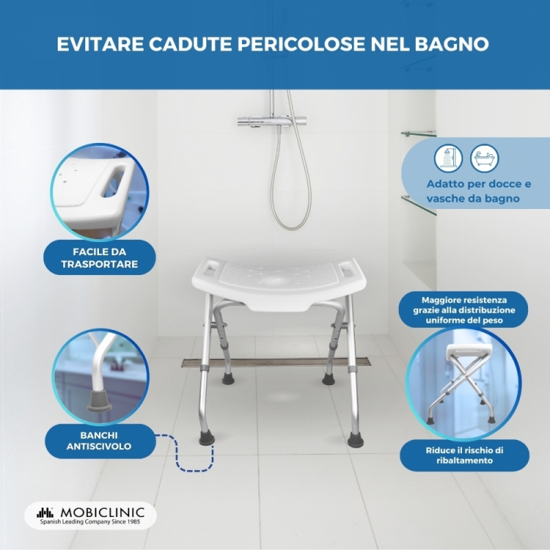 Gli incidenti in bagno sono purtroppo molto comuni e, le difficoltà di movimento di anziani e disabili, aumentano la possibilità che che questi accadano. Per questo motivo i nostri sgabelli bagno hanno maniglie laterali in plastica antiscivolo, che aiutano gli anziani a rimanere saldamente seduti, garantendogli una maggiore sicurezza; inoltre, le gambe dello sgabello da doccia hanno puntali antiscivolo. Anche la seduta dello sgabello bagno è in materiale plastico (antiscivolo) e ha fori che permettono all'acqua di fuoriuscire, per una maggiore igiene.