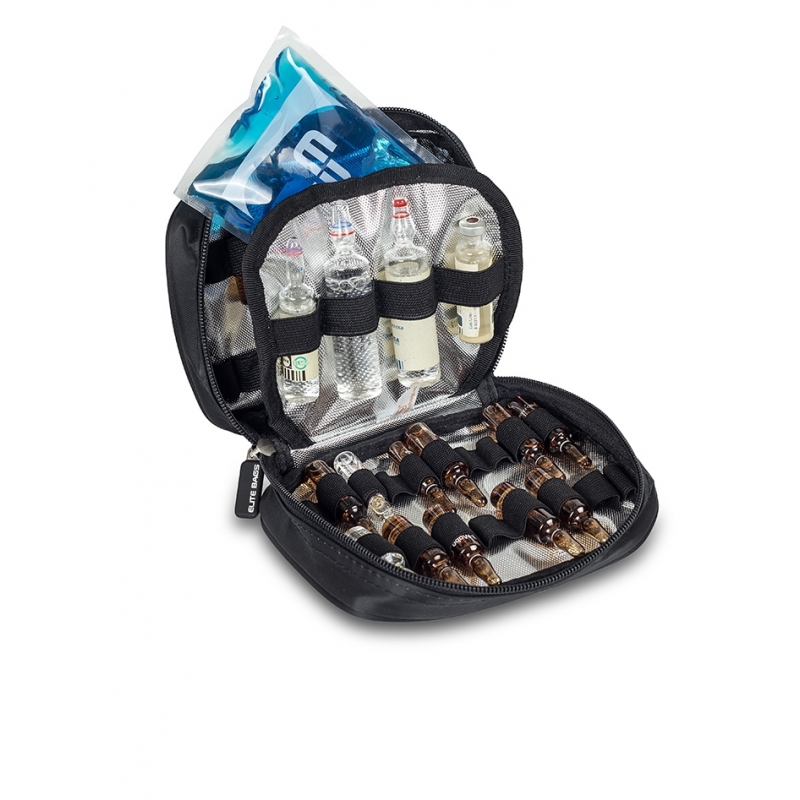 Fiale 1 - 2 ml, confezione da 20 pezzi. 5 - 10 ml e confezione da 6 pezzi. Fiale. Velcro sul retro del borsello portafiale per il fissaggio.